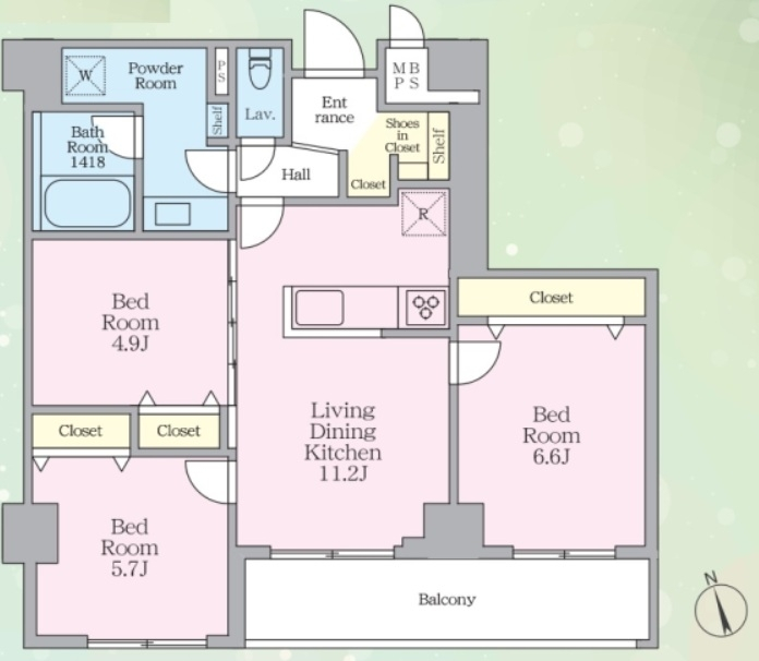 間取り | 3LDK | 間取り詳細 | 洋室6.6・洋室5.7・洋室4.9・LDK11.2 | 専有面積 | 66.23㎡ |
